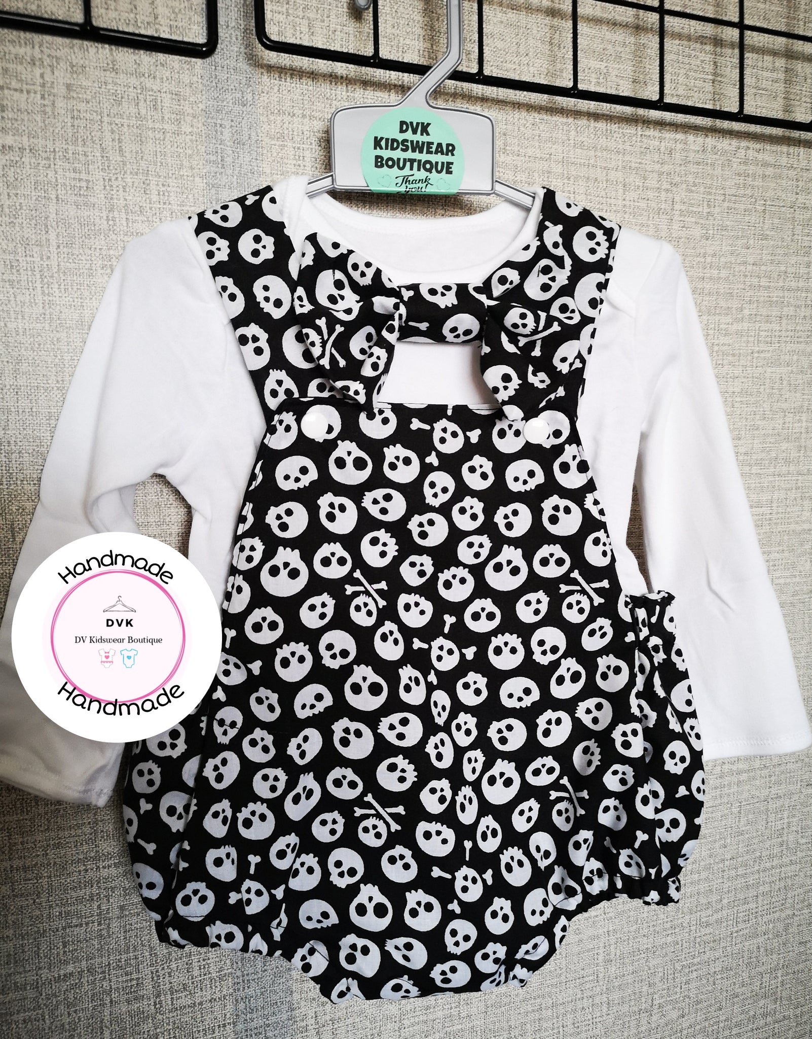 A romper with adjustable snap buttons to next size and elasticated waist, fully lined