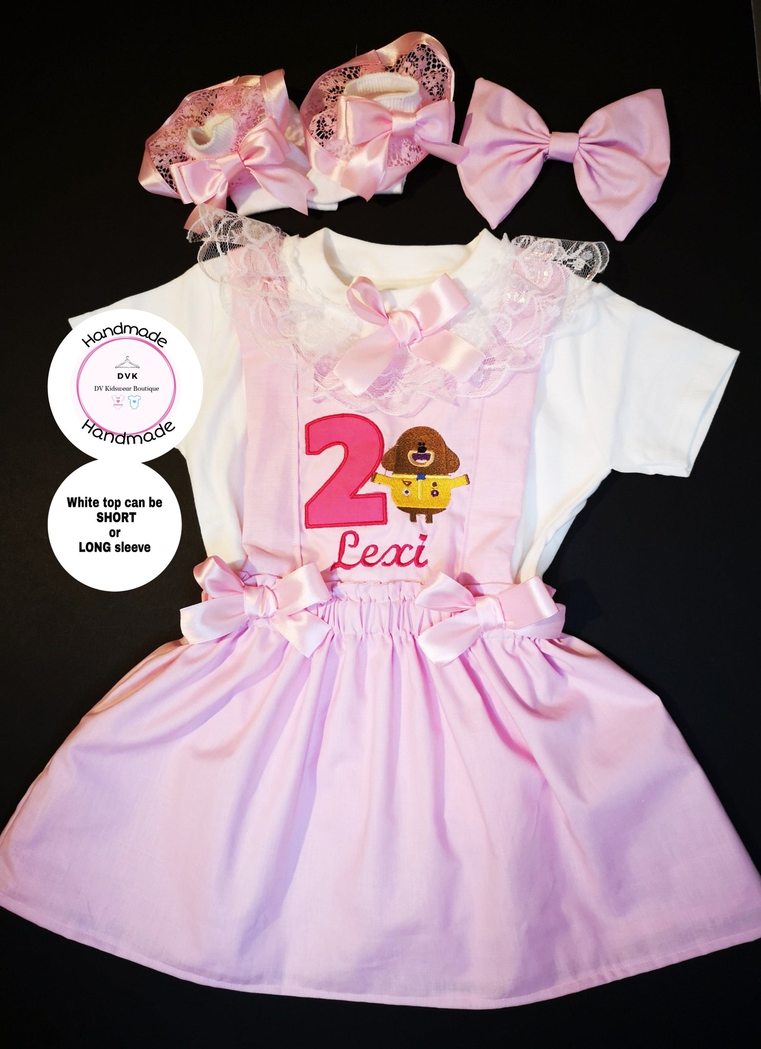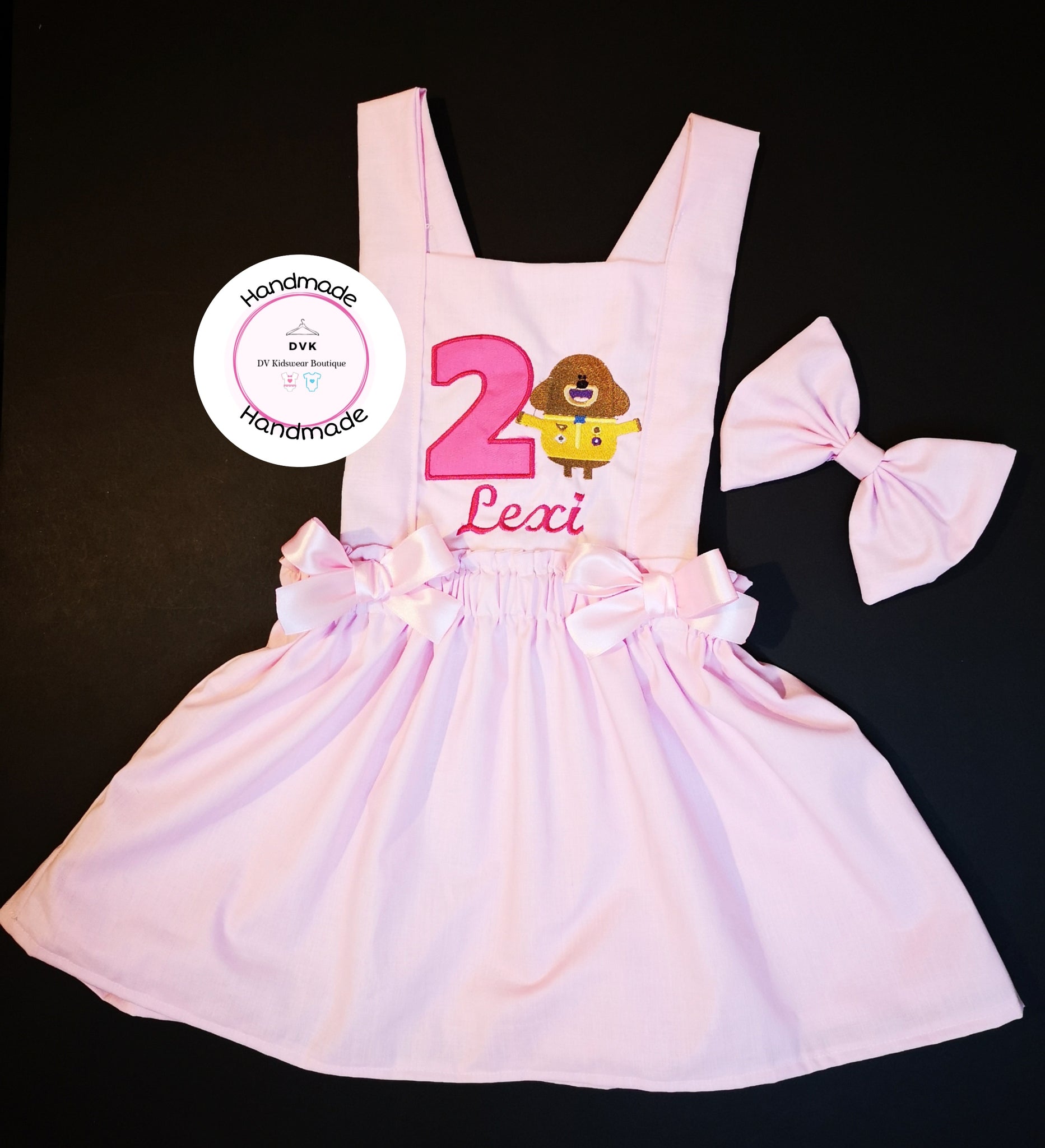 Pinafore Dress with bows sewn on, waist elasticated, embroidered either duggee + child name Or Duggee + Child name and Age OR First initial letter + child name +duggee